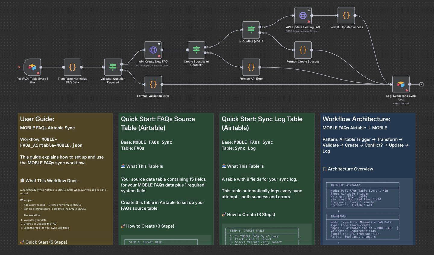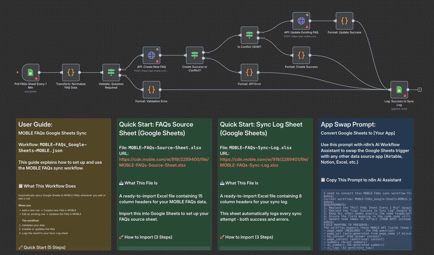 - No Sync Log: Confirm the Google Sheets credential and names: MOBLE-FAQs-Sync-Log / Sync Log.