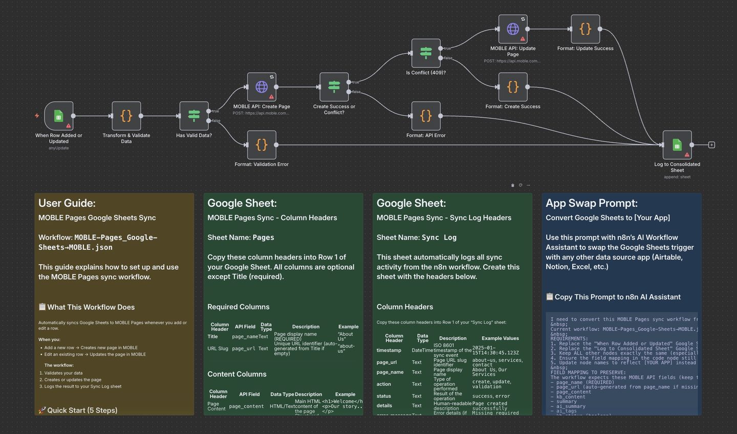 - No Sync Log: Confirm the Google Sheets credential and names: MOBLE-Pages-Sync-Log / Sync Log.