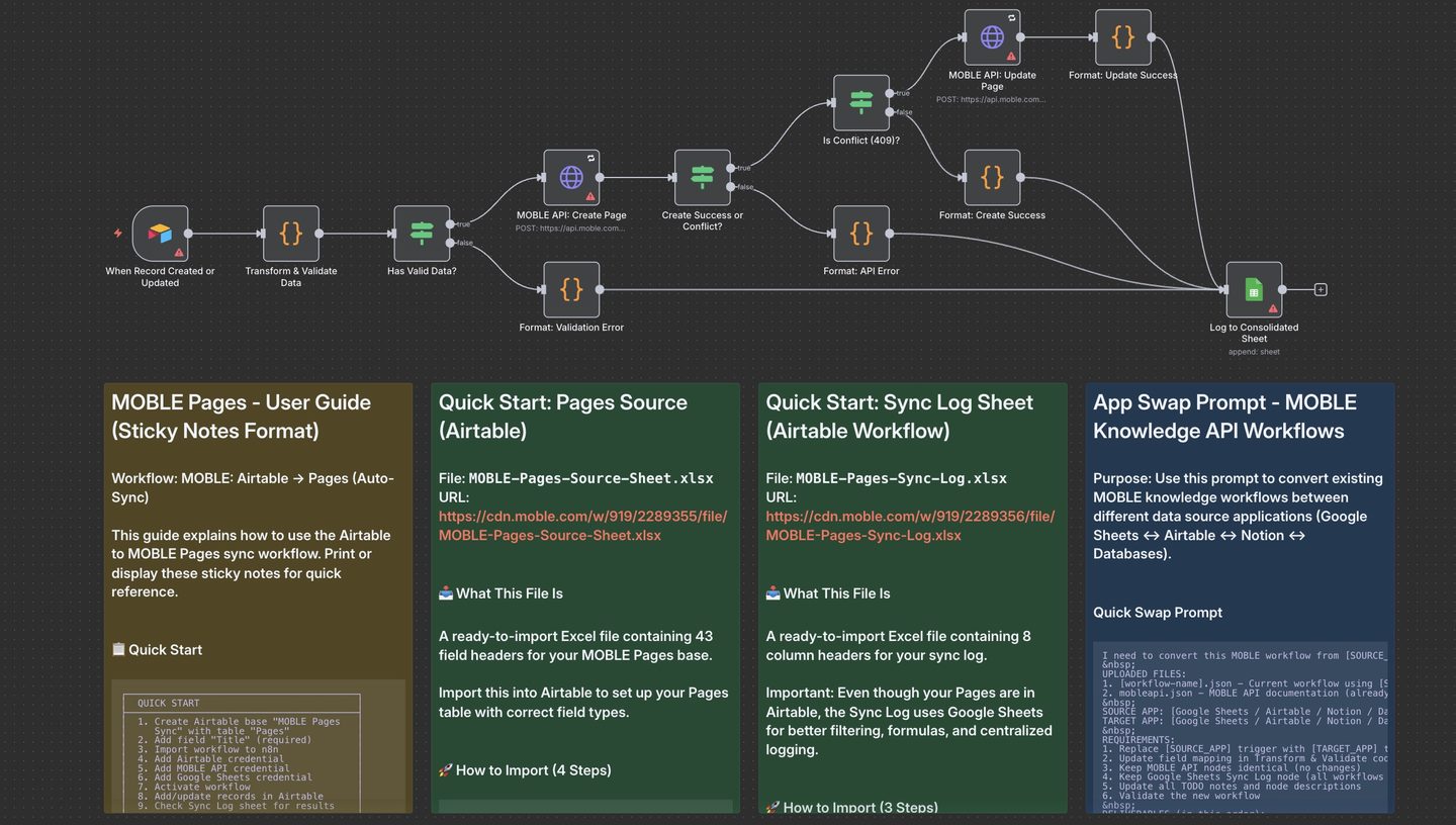 Use a Google Sheet or Airtable Base as a live content editor to add/edit Page content in MOBLE. When rows are added or updated, n8n automatically syncs them to MOBLE Pages, updating your site and AI Knowledge Base. All results are recorded to a Google Sheets Sync Log (even when Airtable or another app is the source).