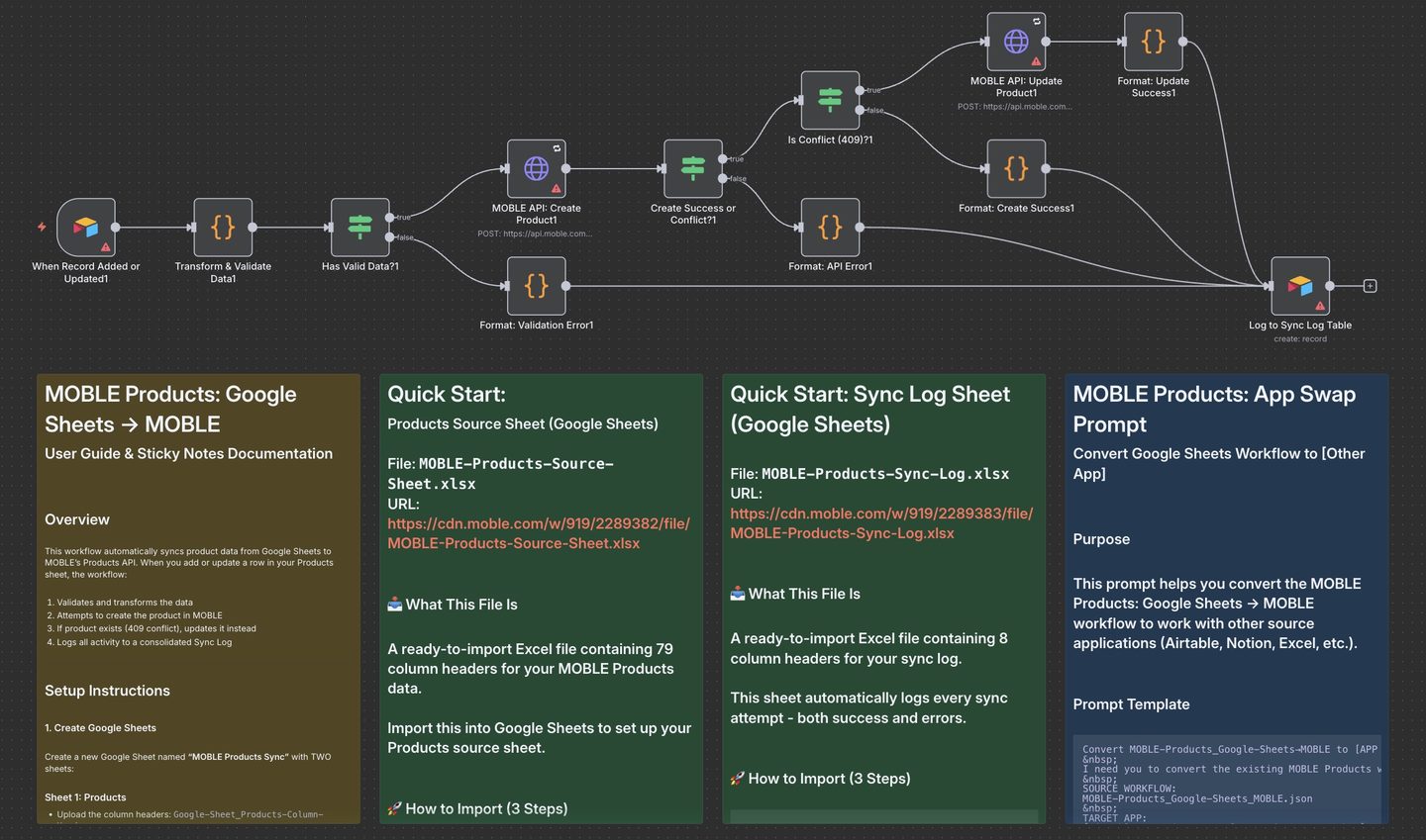 Use a Google Sheet or Airtable Base as a live product editor to add/edit Products in MOBLE. When rows are added or updated, n8n automatically syncs them to MOBLE Products, updating your site and AI Knowledge Base. All results are recorded to a Sync Log (Google Sheets or Airtable).