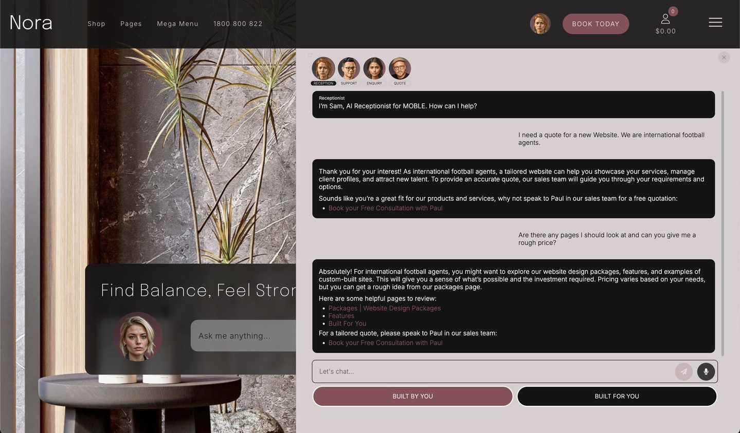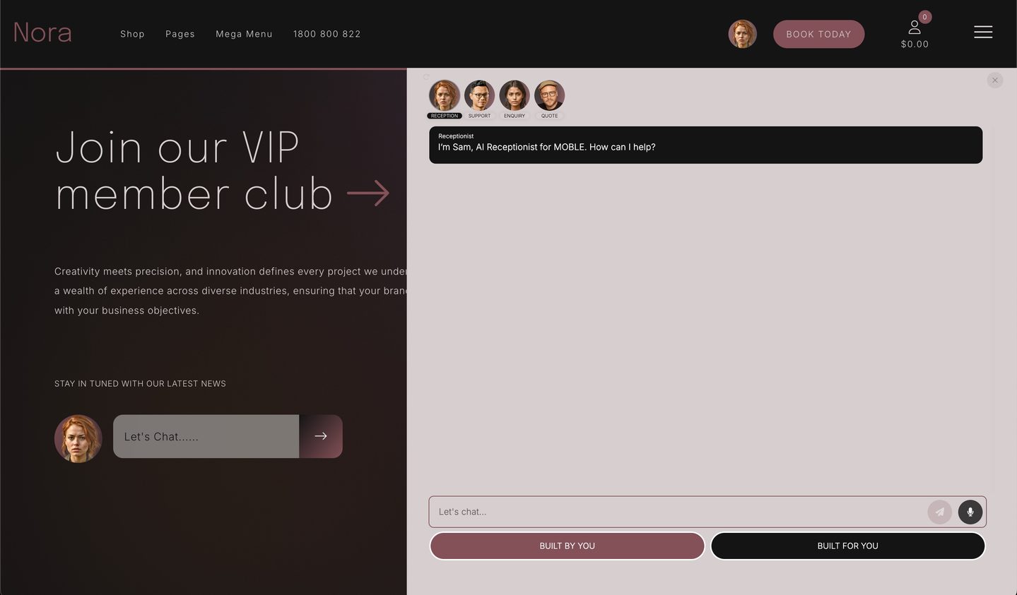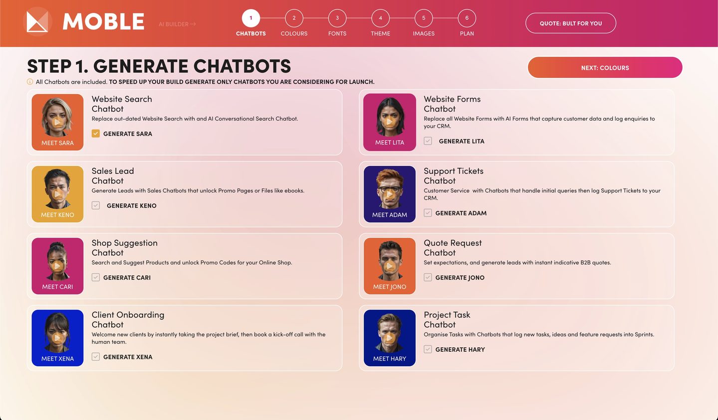 Born on MOBLE CMS, now embeddable on any website. Choose from 7 Chatbot Embeds (always adding more). Each embed begins with a simple prompt and then opens the slide-in Chatbot Drawer for the full conversation—clean UI, zero clutter.
