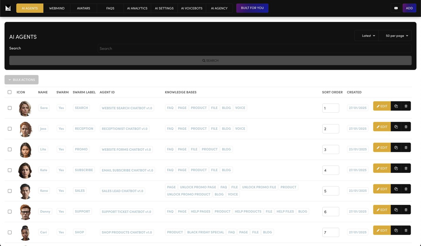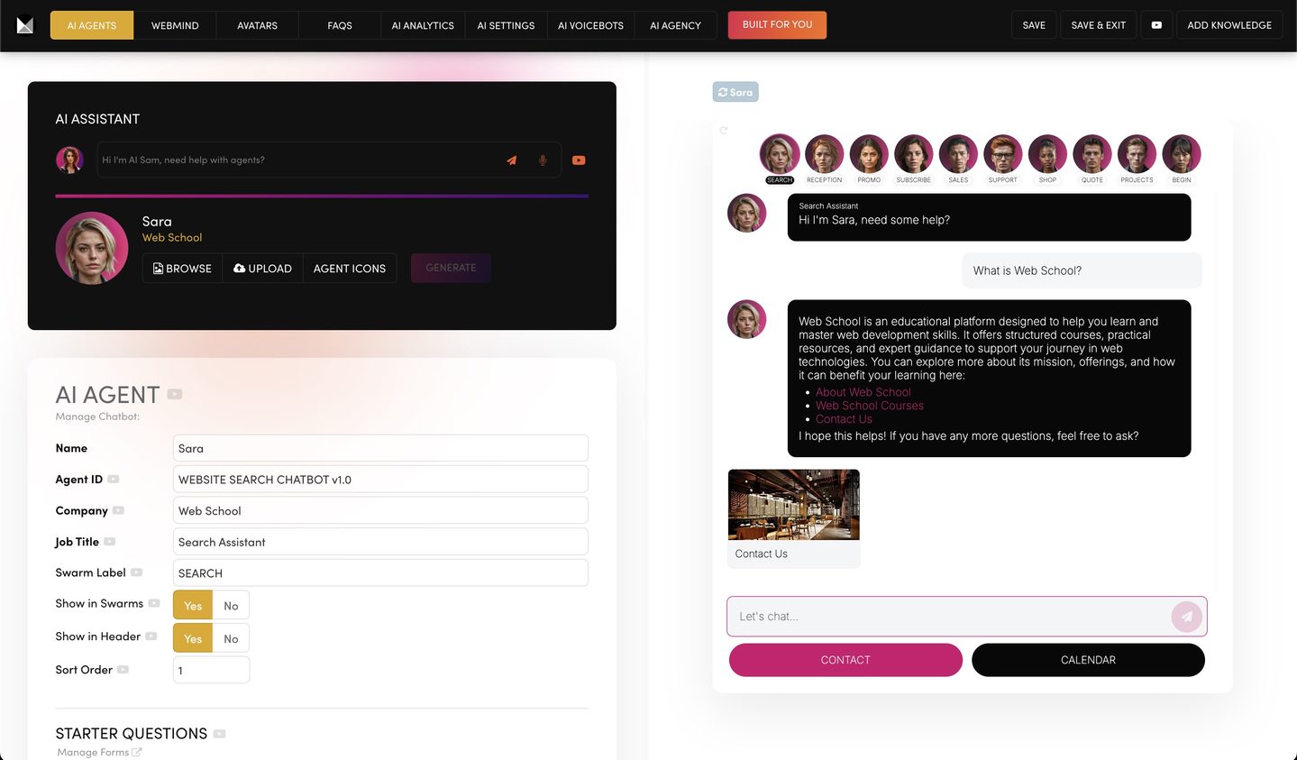Build production-ready chatbots fast and scale with confidence. Start with 10 Templates, shape precise answers with the KB Tool Library, refine behaviour in the Prompt Drawer, and guide users with Action Buttons. Your Agent Swarm hands conversations to the right bot via Switchboard, all presented through a clean Chatbot Carousel and tracked in Feedback & Analytics.