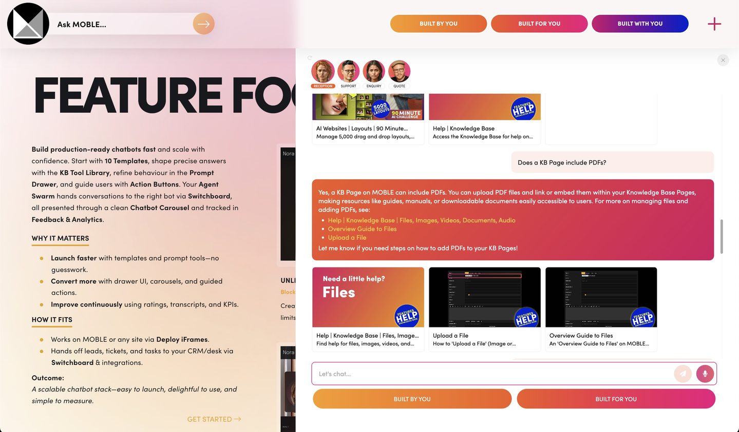 Embed anywhere: use the iFrame Builder to copy/paste into any site, or drag-and-drop Blocks & Layouts in the MOBLE Page Builder. Configure everything in one place—set Drawer width, toggle the Agent Swarm Menu, and choose whether to show persistent Action Buttons and Customer Feedback (thumbs up/down).