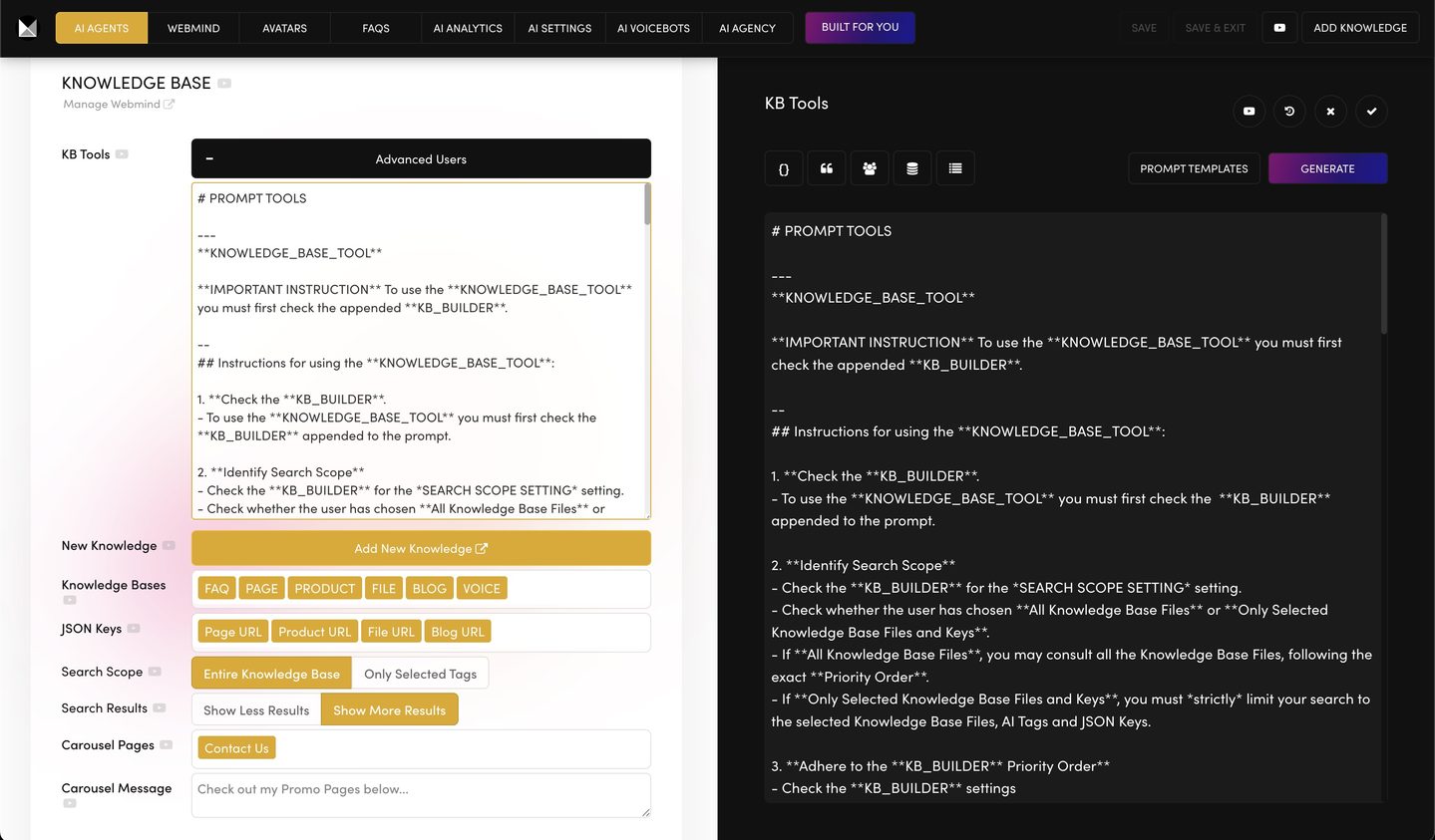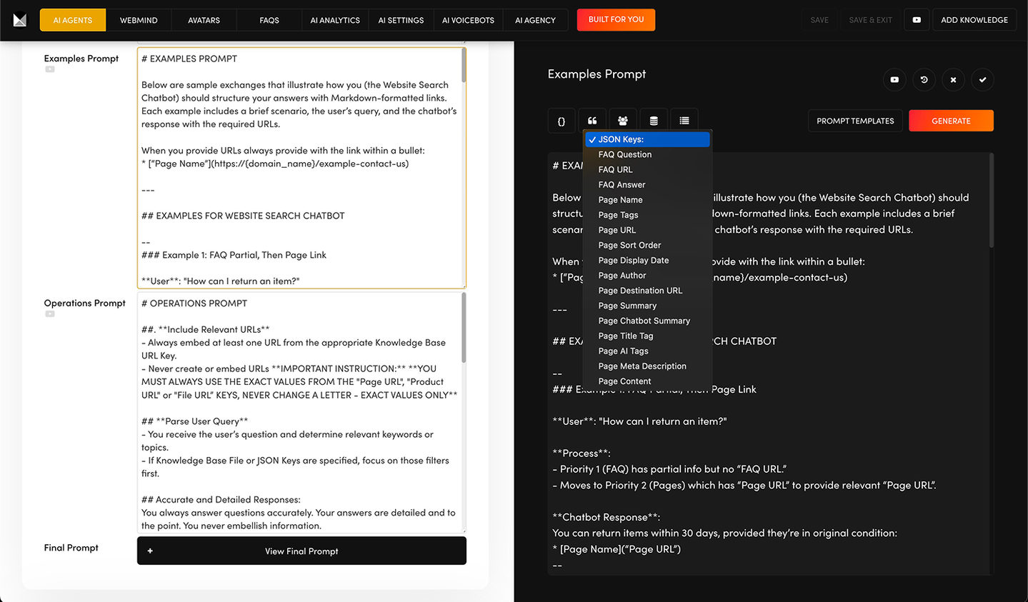 Start fast with 10 plug-and-play templates (search, forms, leads, support, quotes, onboarding, projects, shop suggestions, and more). Then tailor behaviour with prompts—manually or generate with the AI Copilot.
