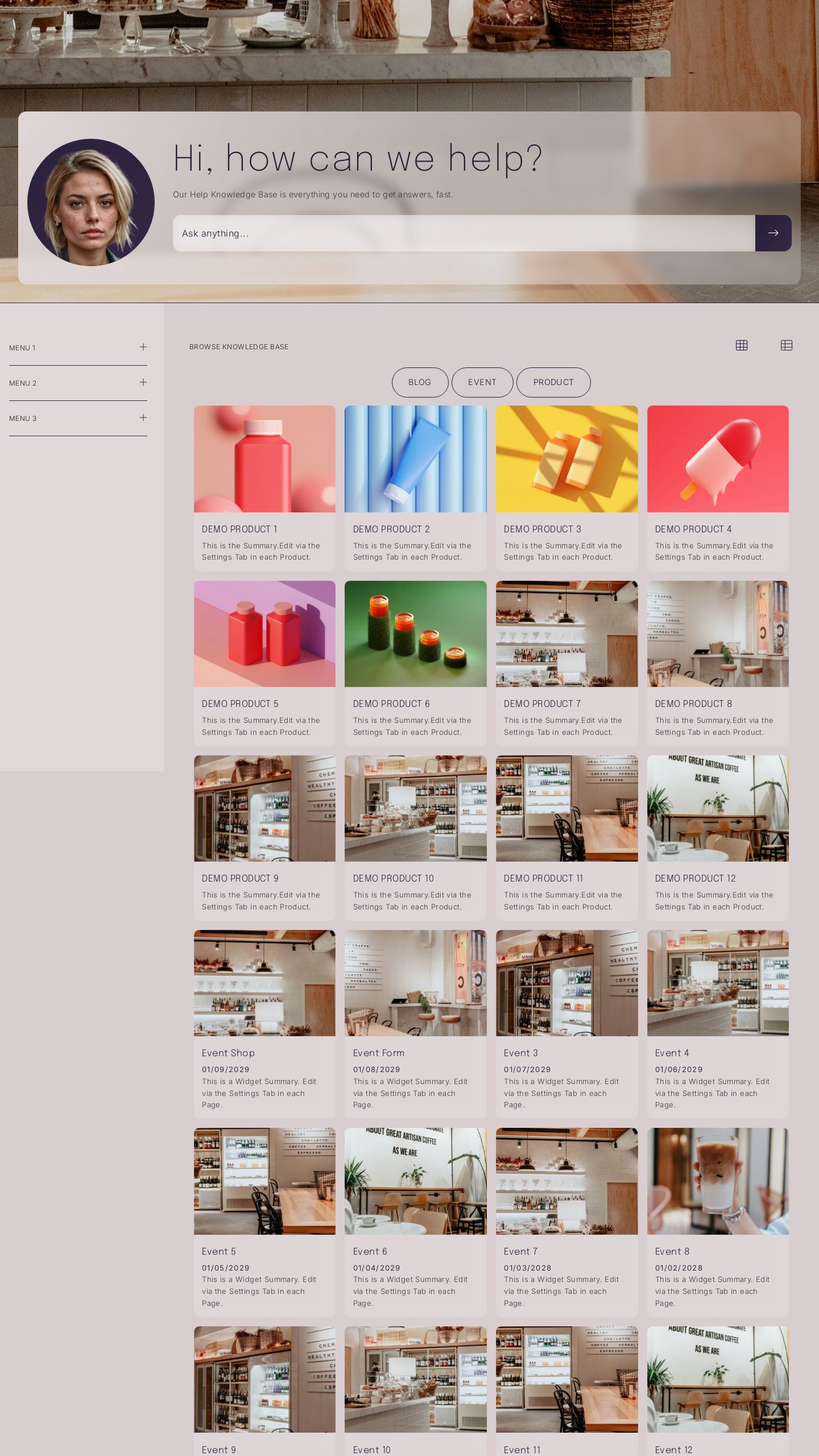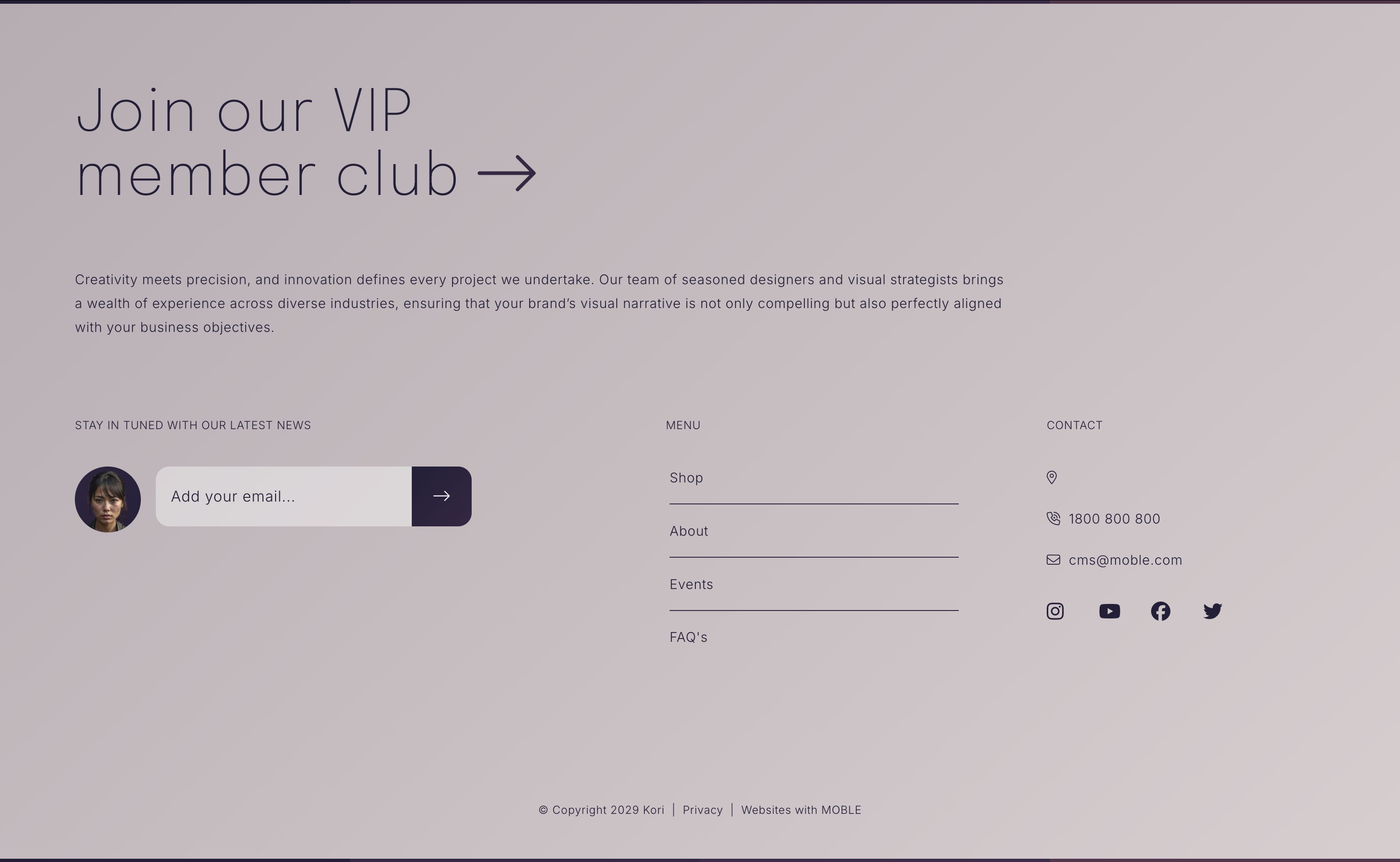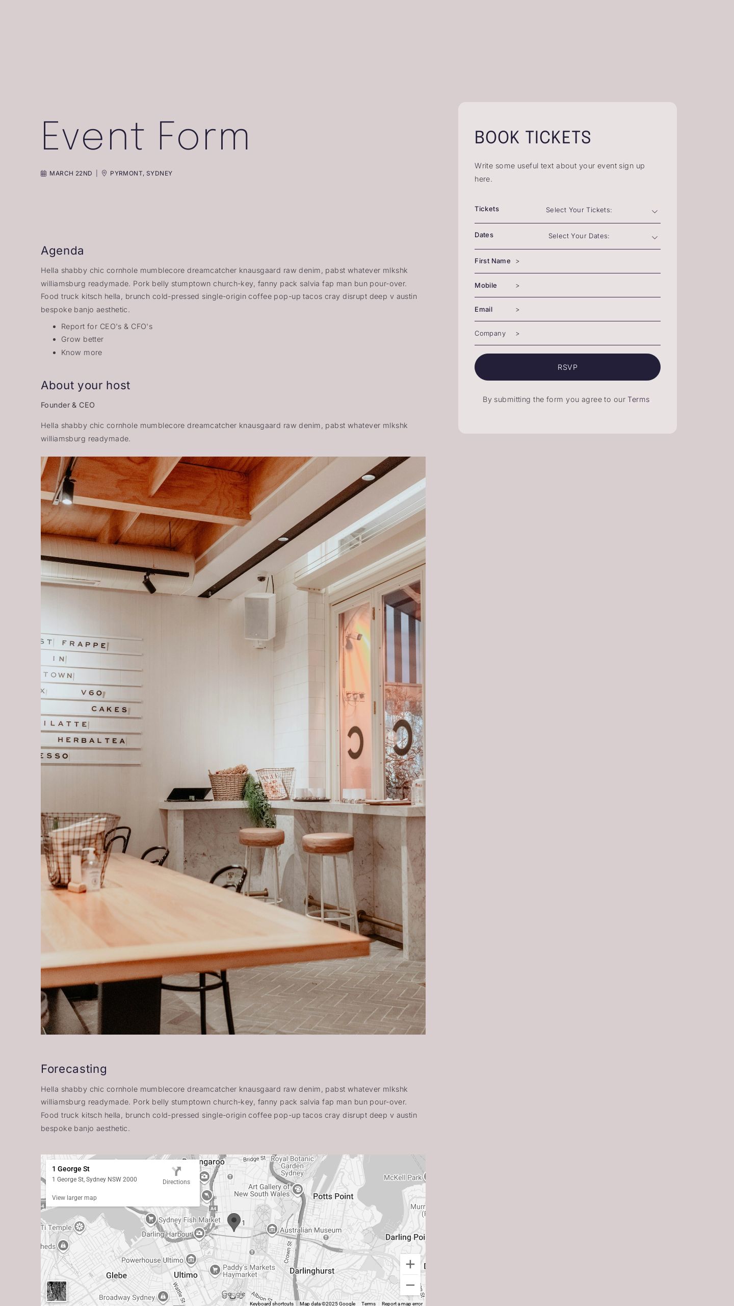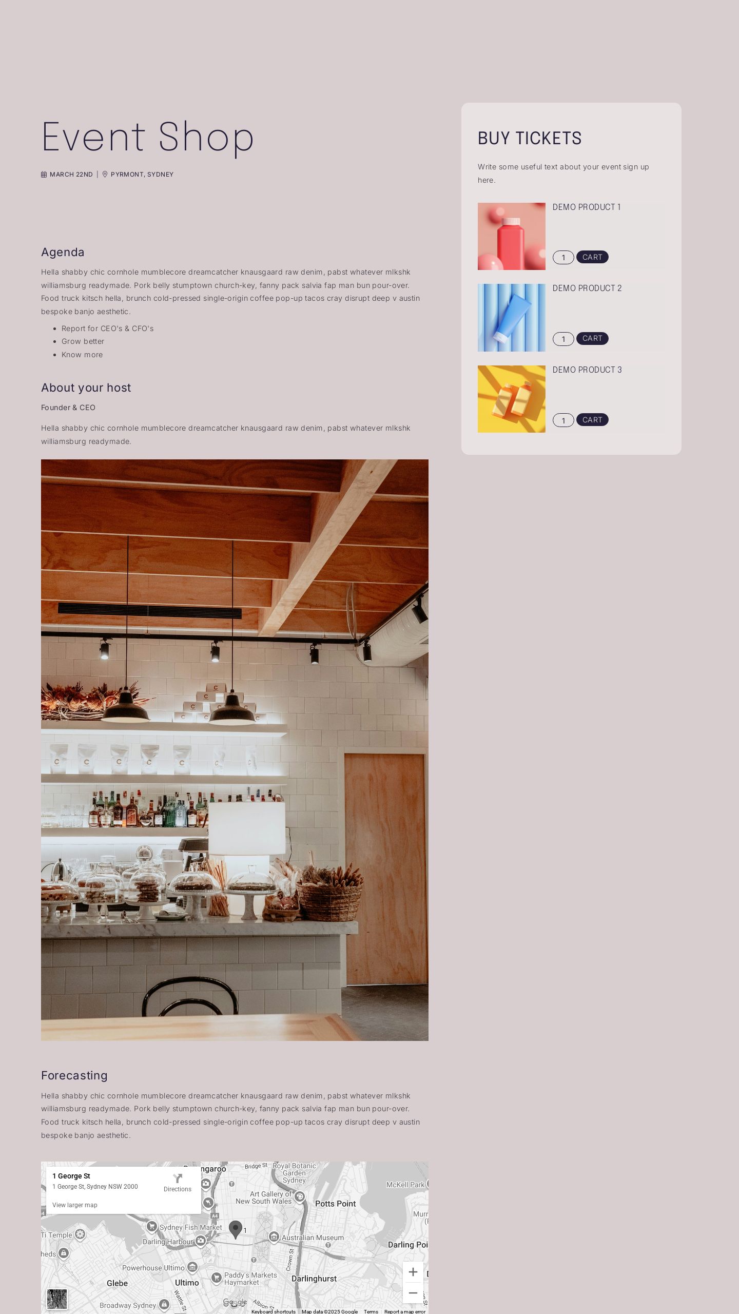 Create events to sell tickets in a shop, or subscriptions via a form. Be inspired with a 100 event layoust to choose from and fully customise to make your own.