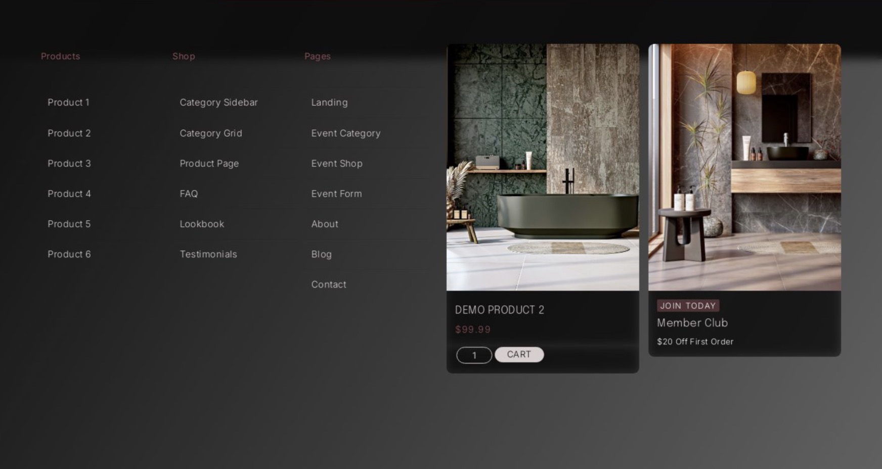 Headers are a key part of you werbsite housing you menus and navigations and key call to actions. All MOBLE headers have unlimited multi-menu tiers and can server 1,000's of pages with ease. Choose from over 100, or even ask us to build a custom one for you.