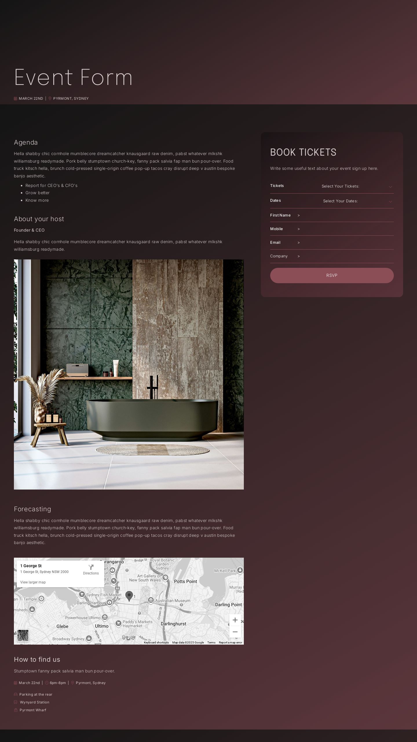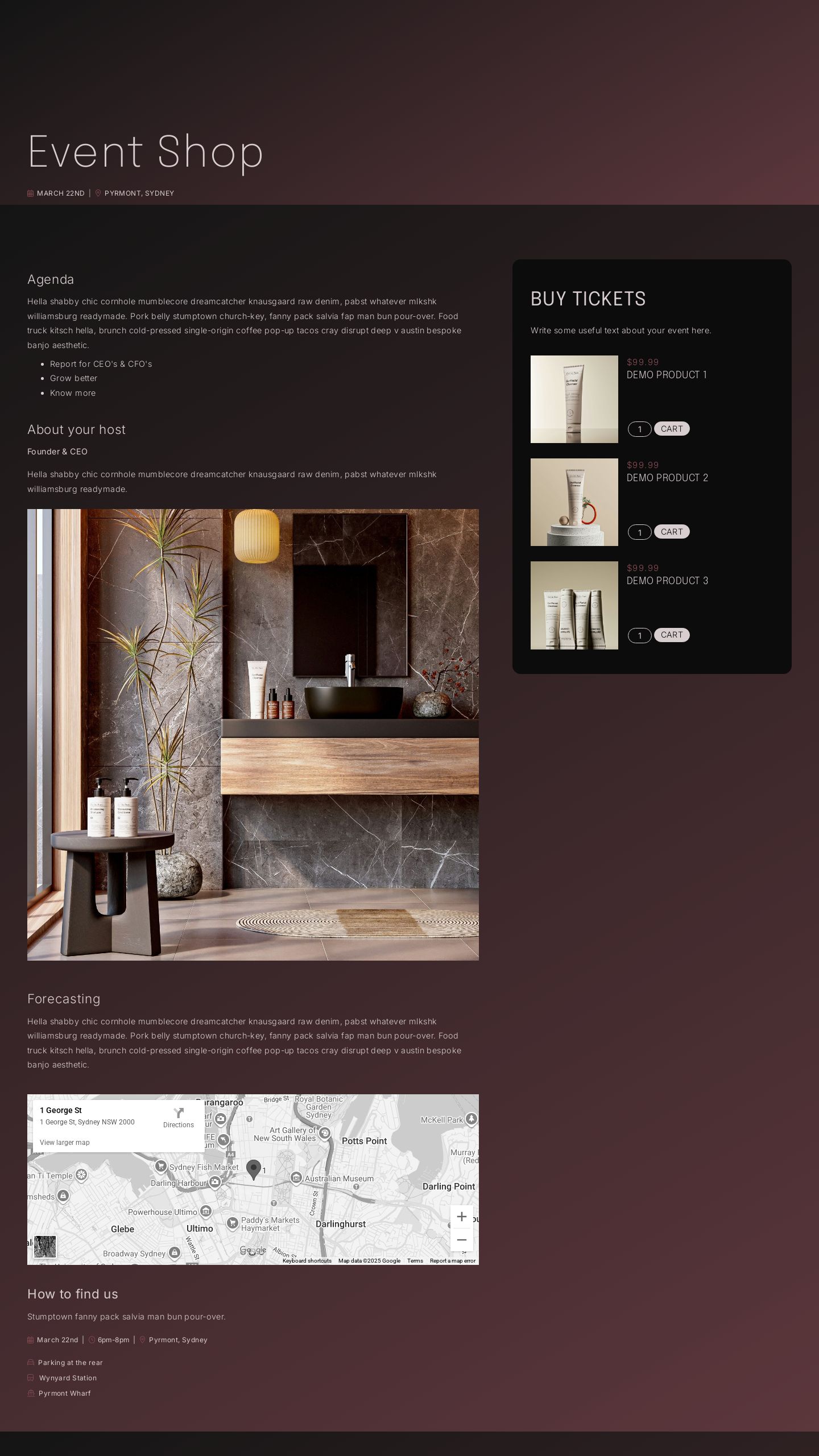 Create events to sell tickets in a shop, or subscriptions via a form. Be inspired with a 100 event layoust to choose from and fully customise to make your own.