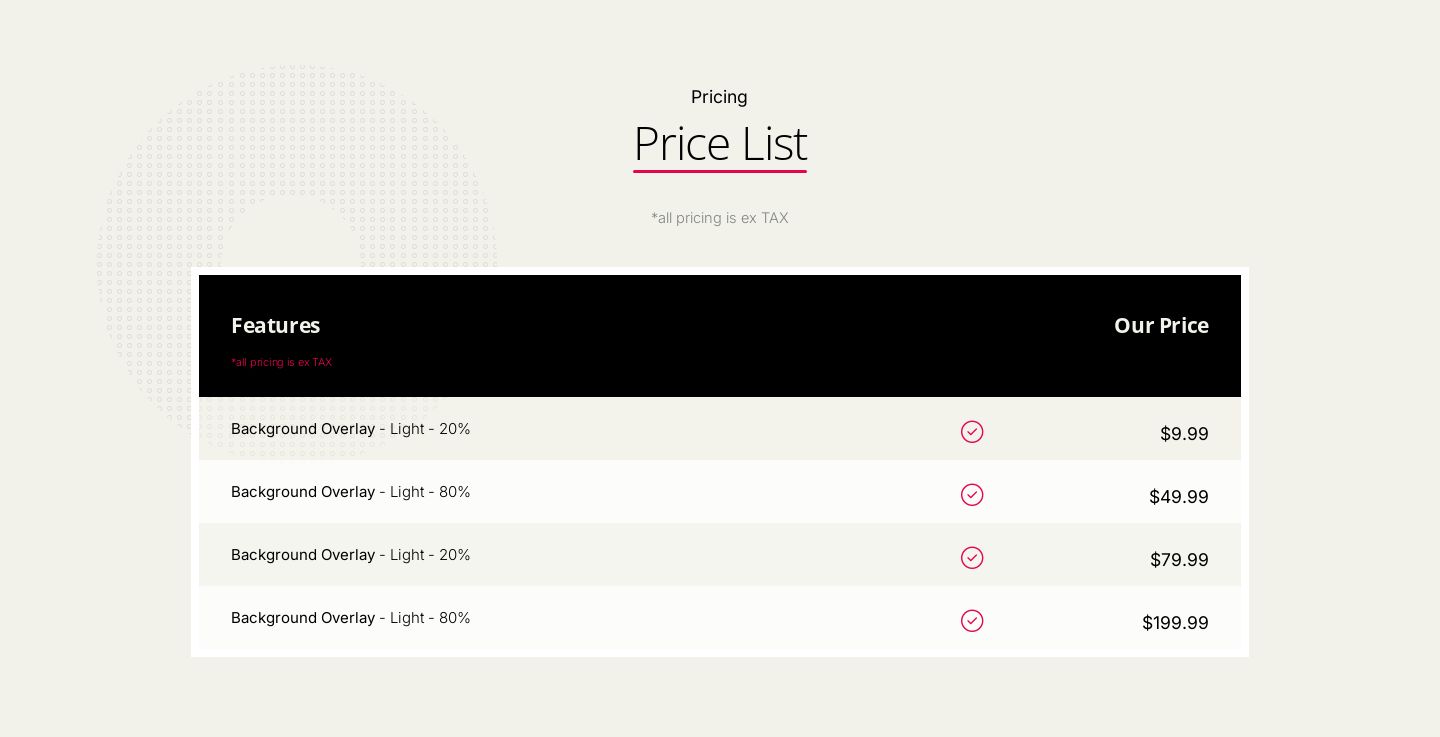 Price List, Tables, Sales Bullets, FAQ's are just a few types of lists. Build cutsom lists and menus in moments or pick from 100's that are waiting to go.