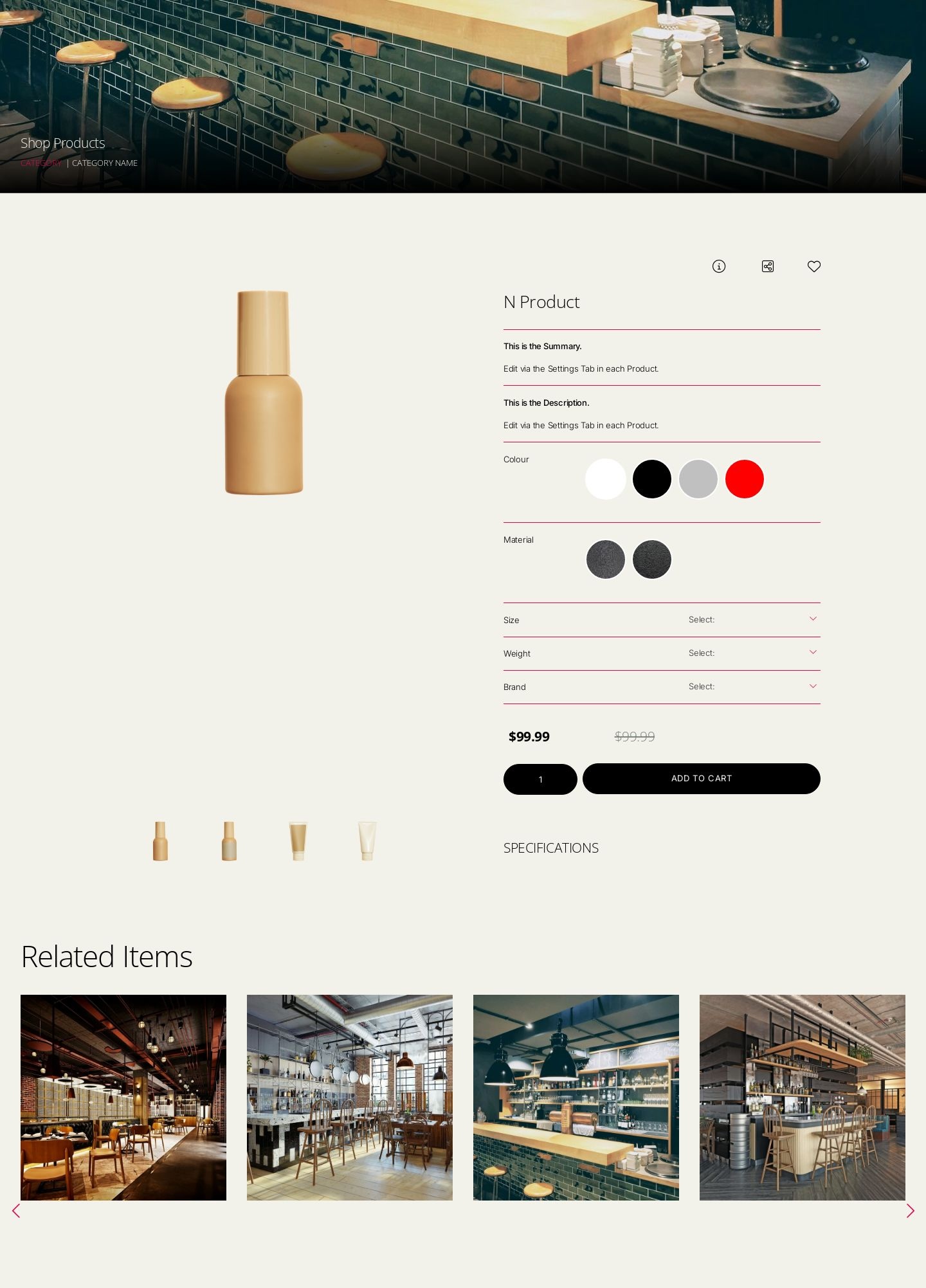 Product Pages and Category pages are an essential part of your shop. All are complete, with unlimited options and variants, tabs, lists and related items.