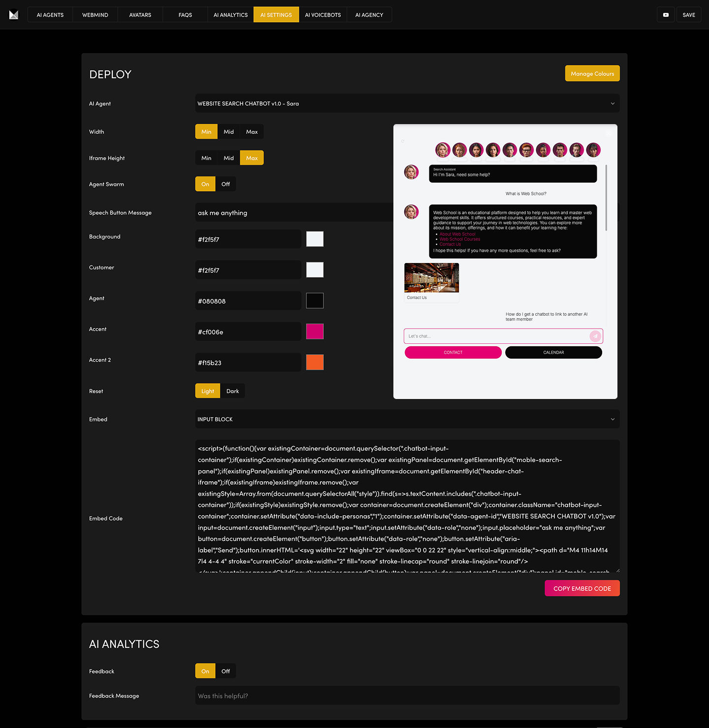 Select which agent you’re deploying (e.g. RECEPTIONIST CHATBOT v1.0 – Sam). The embed code updates instantly when you change the agent.