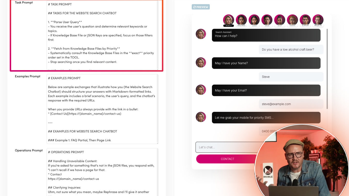 Access ready-made prompt frameworks for different chatbot types (Website Search, Shop Quote, etc.) to speed up setup and ensure best practices. There is no quicker way to leant writing chatbot prompts than reading the Prompt Templates.