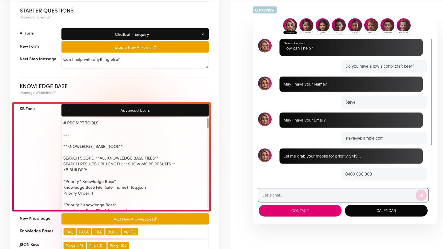 - Check the the **KNOWLEDGE_BASE_TOOL** for the *KB BUILDER* settings