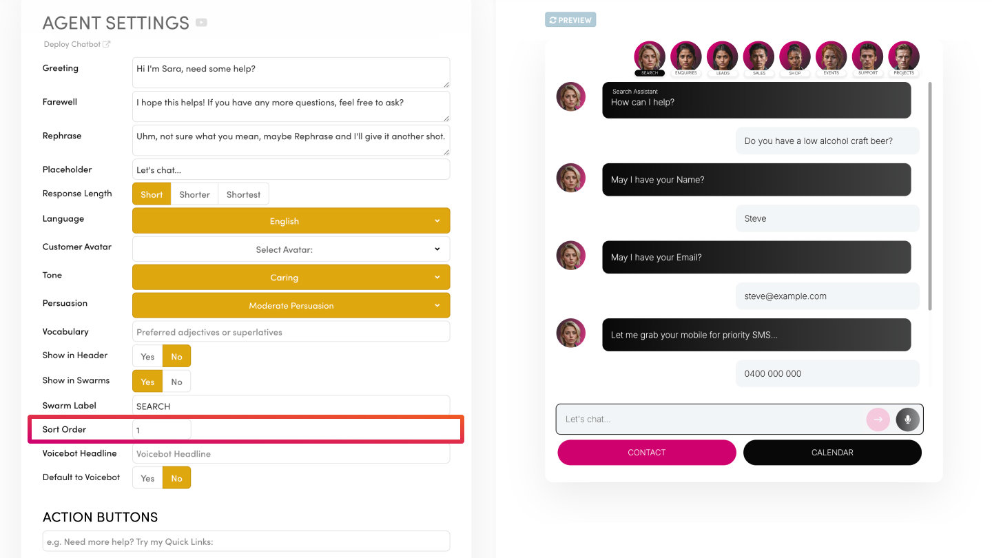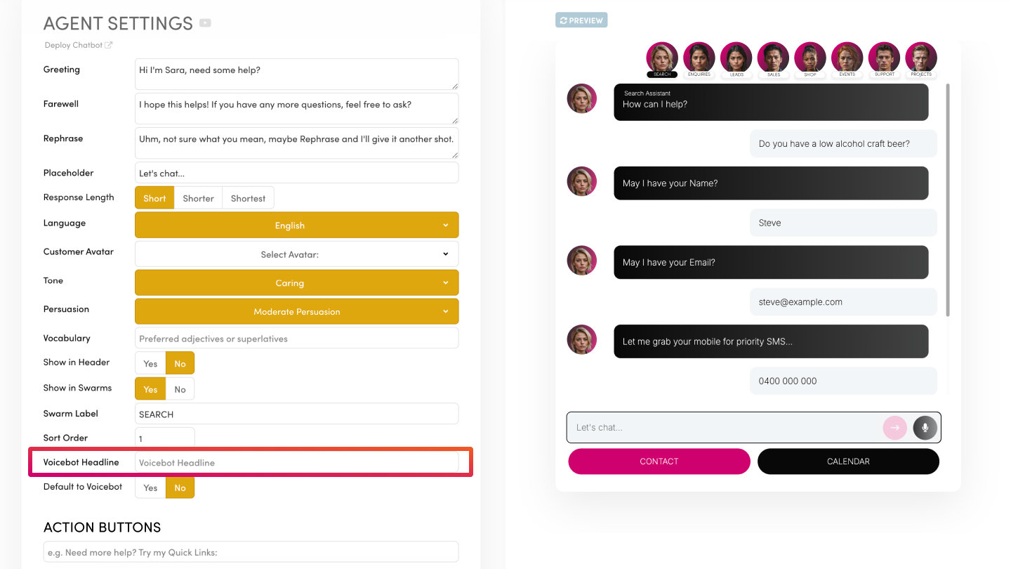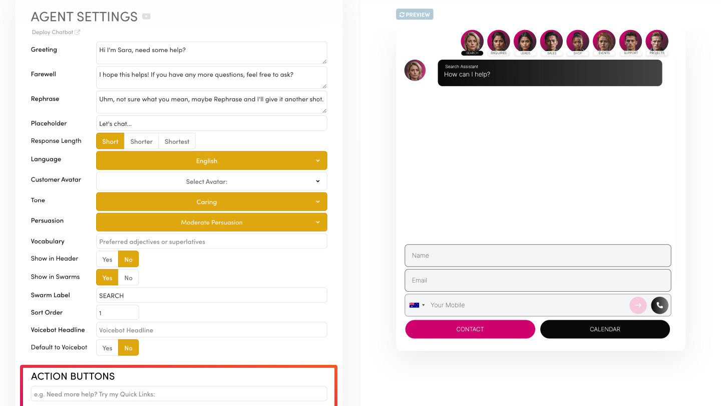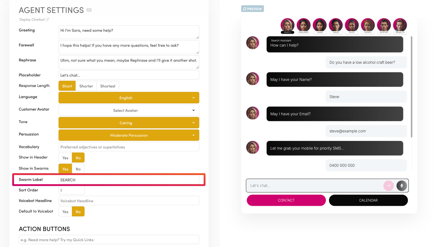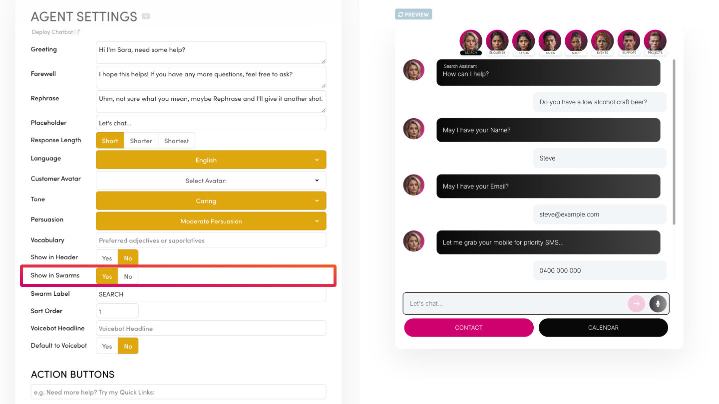 When Show in Swarms is set to YES, the Chatbot’s icon appears in the Swarms menu at the top of your Chatbot interface. Users can then click on each icon to switch between different AI Agents (e.g., SEARCH, SHOP, SUPPORT). If set to NO, this Agent is hidden from the swarm.