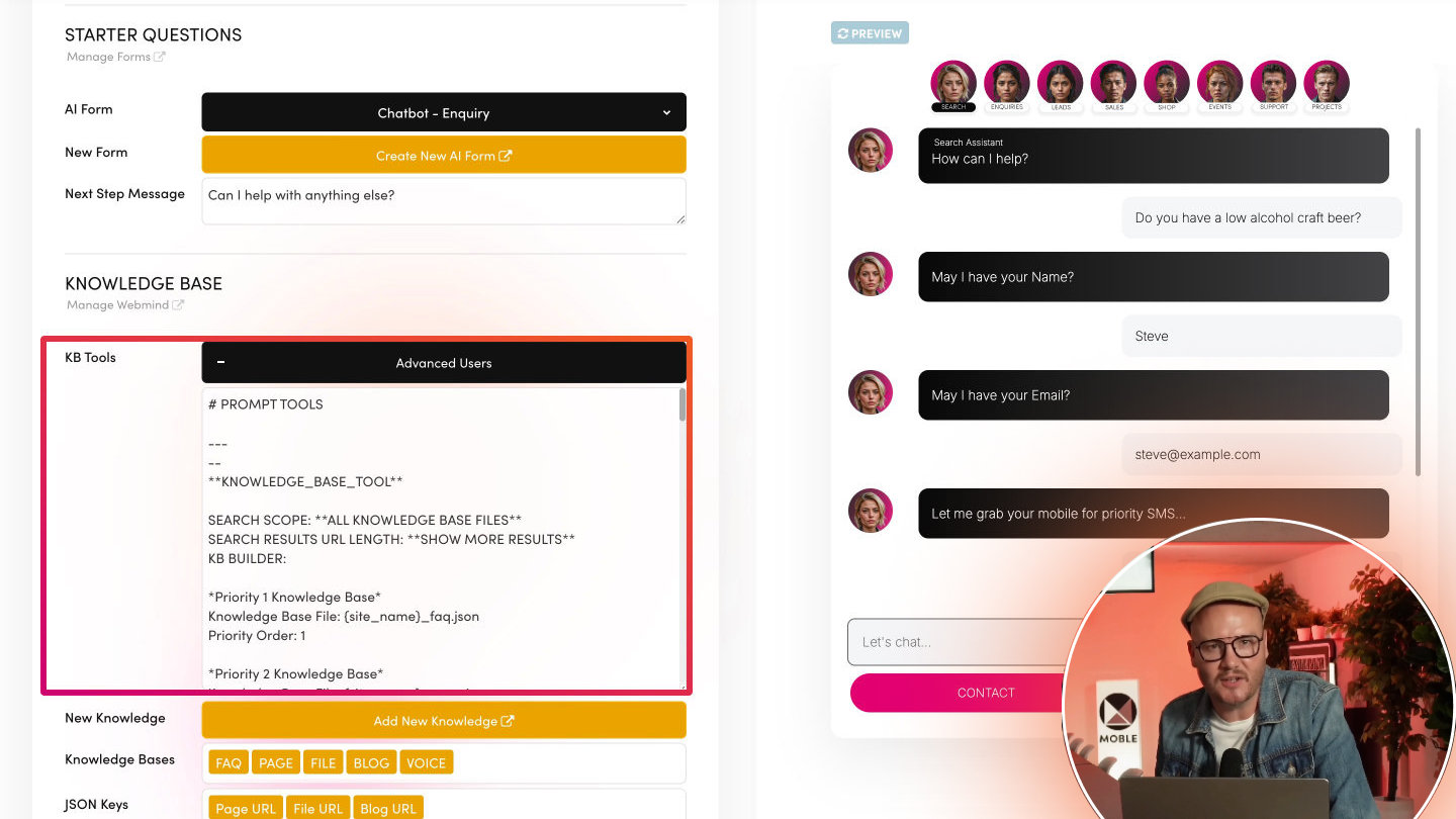Outline the specific tasks or processes your Chatbot must follow, from answering queries to generating quotes or searching knowledge bases.