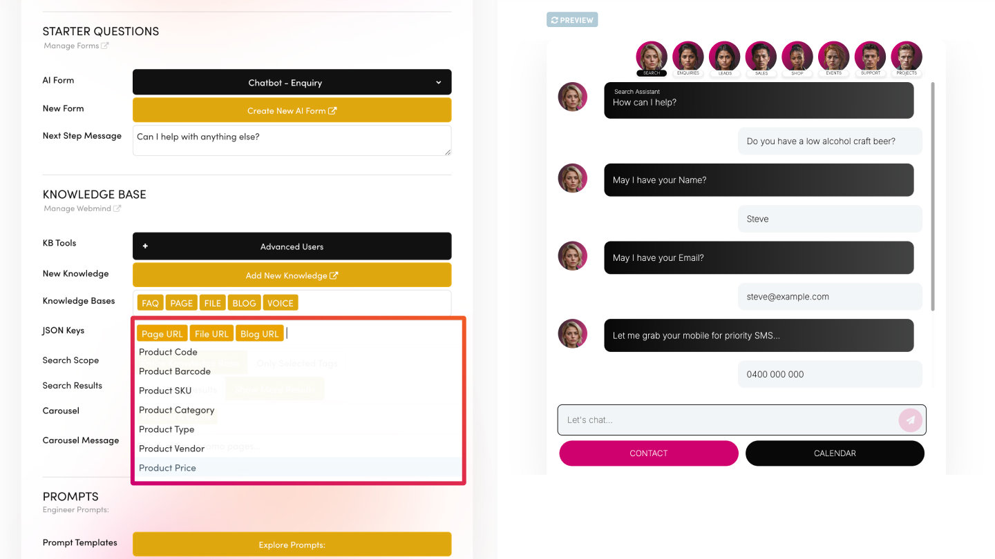 Manage all website content (pages, products, files, etc.) in one place. Use AI Tags and JSON Keys to feed relevant data into your Chatbots, enabling everything from standard website search to advanced AI forms and Voicebot calls.