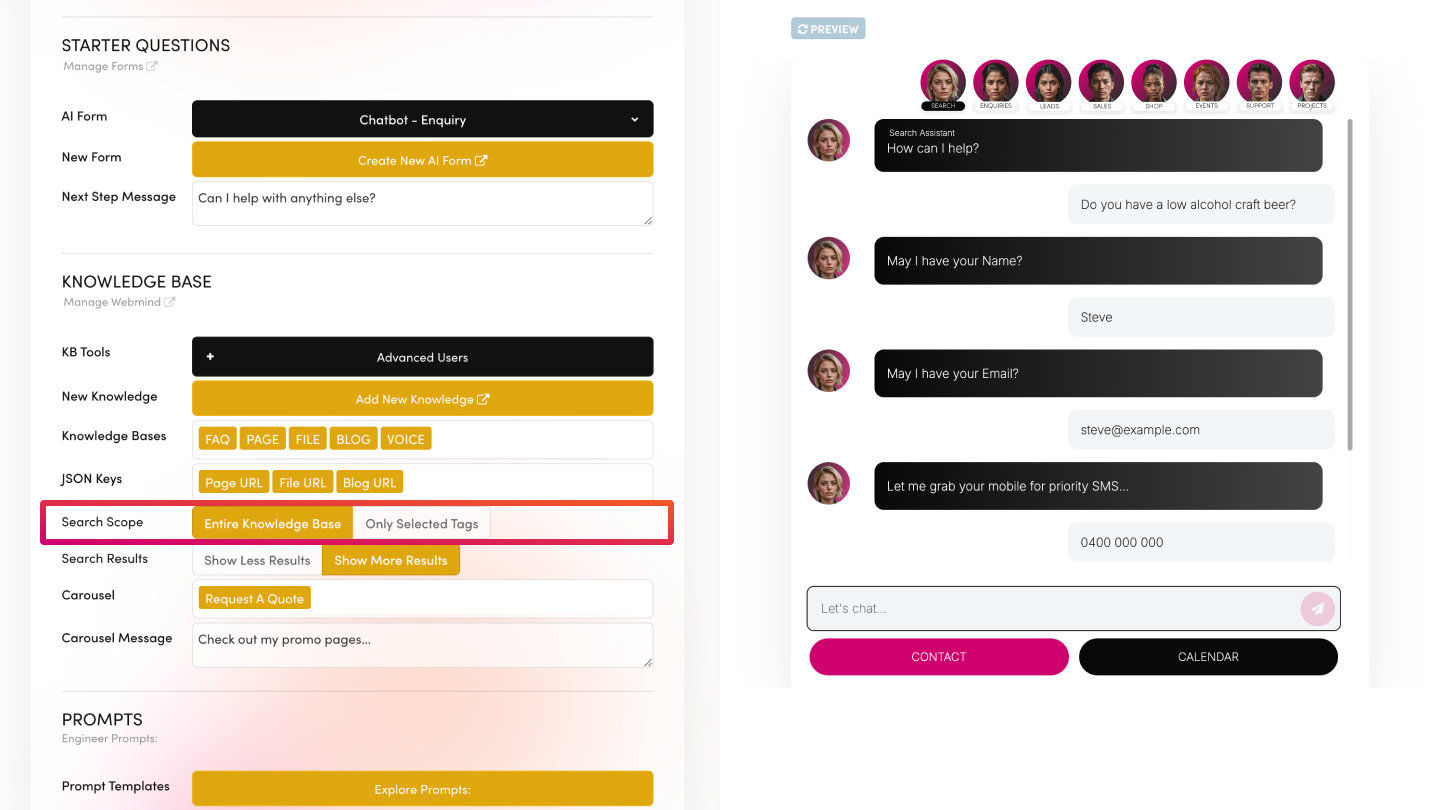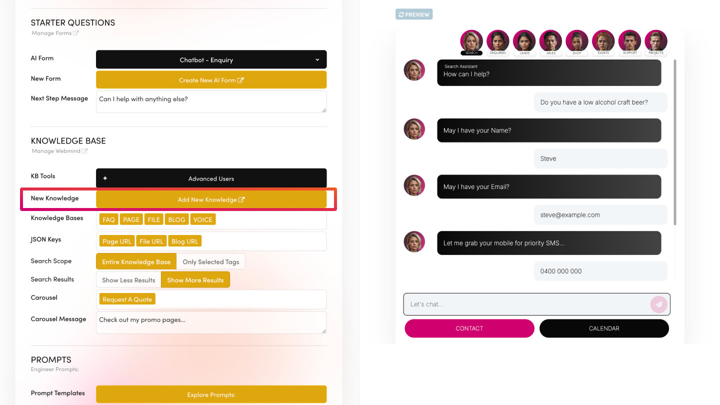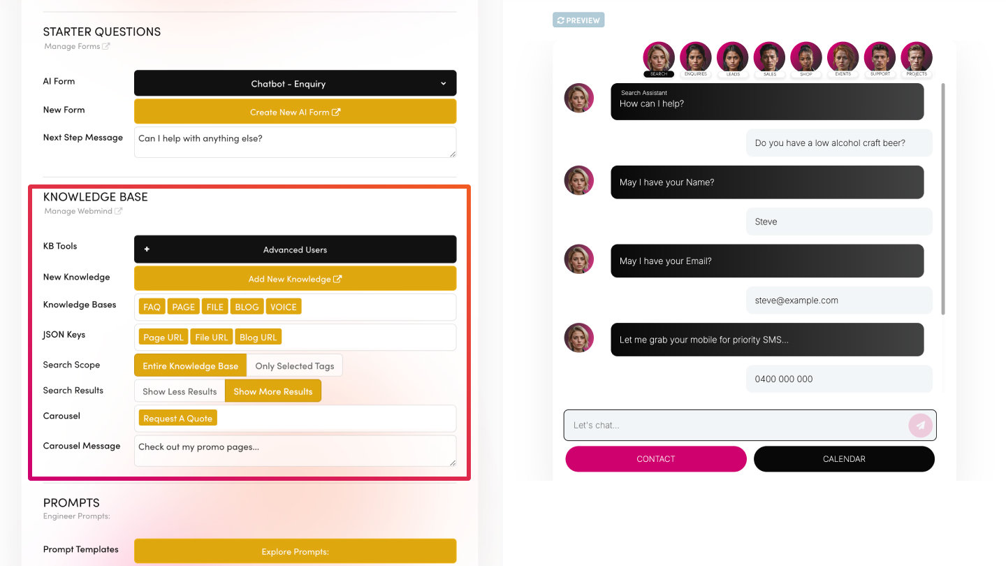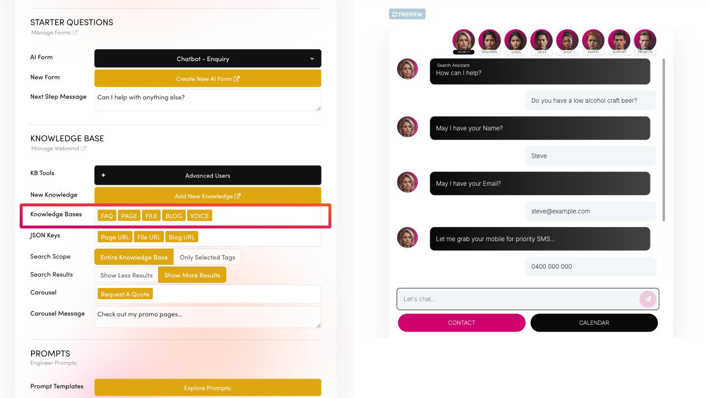 For AI Forms (logging sales leads, support tickets) or AI Voicebot calls, Webmind remains the underlying data set, ensuring one Knowledge Base with consistent answers across all Chatbots.