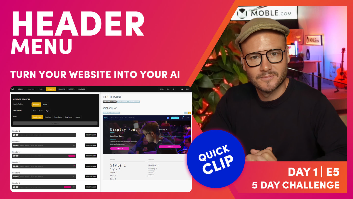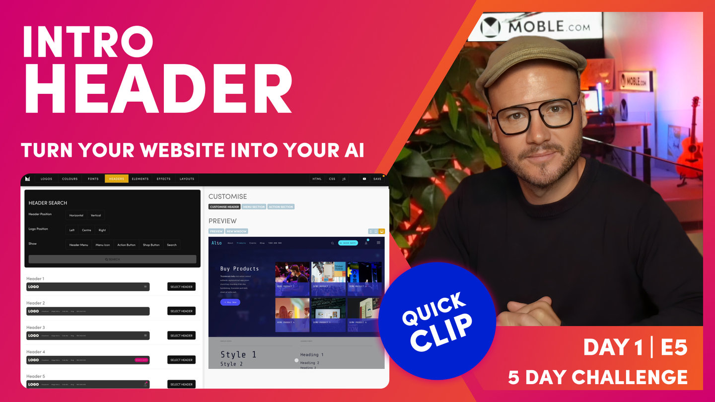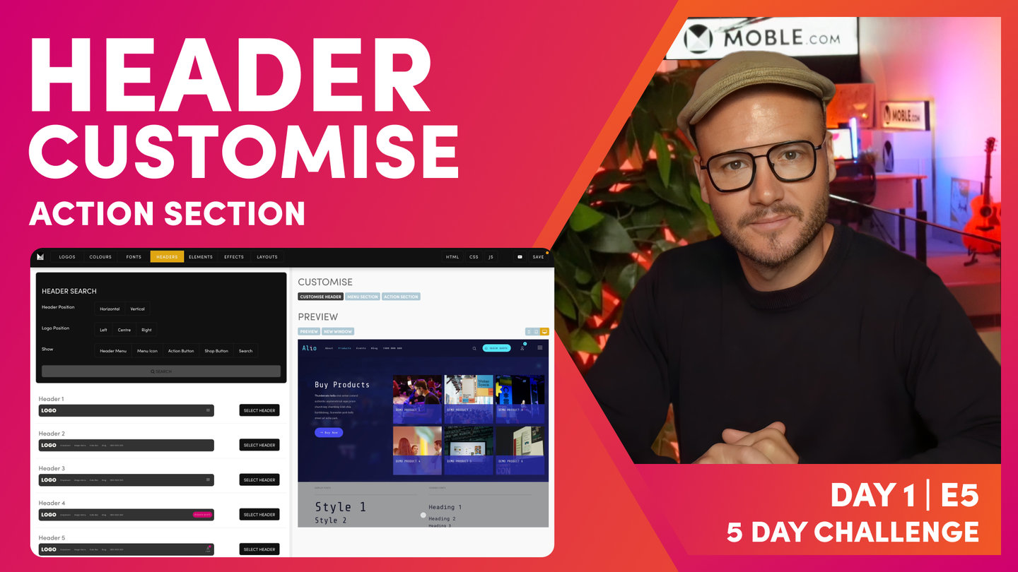 So think of this episode as a precursor, as a quick setup before we get to day two. So definitely just jump ahead, choose a header, and maybe choose some of the customised header preferences. You'll be flipping between the menus, the navigation area, and the header area tomorrow in episode one. Okay. And the third thing to realise is, although we've got a 100 pre-formatted headers here, and we'll always add in more, you can actually go and customise your own headers with HTML, CSS and JavaScript if you know code but that's not part of the five-day challenge, so stay tuned for later masterclass episodes, where we'll focus on that. And if you don't know code, you might be able to learn code quite quickly when you watch these masterclass sessions because the coding here is not so complicated. So without further ado, let's get on with it. Let's pick your header and then race through it and we'll move on to the next episode.