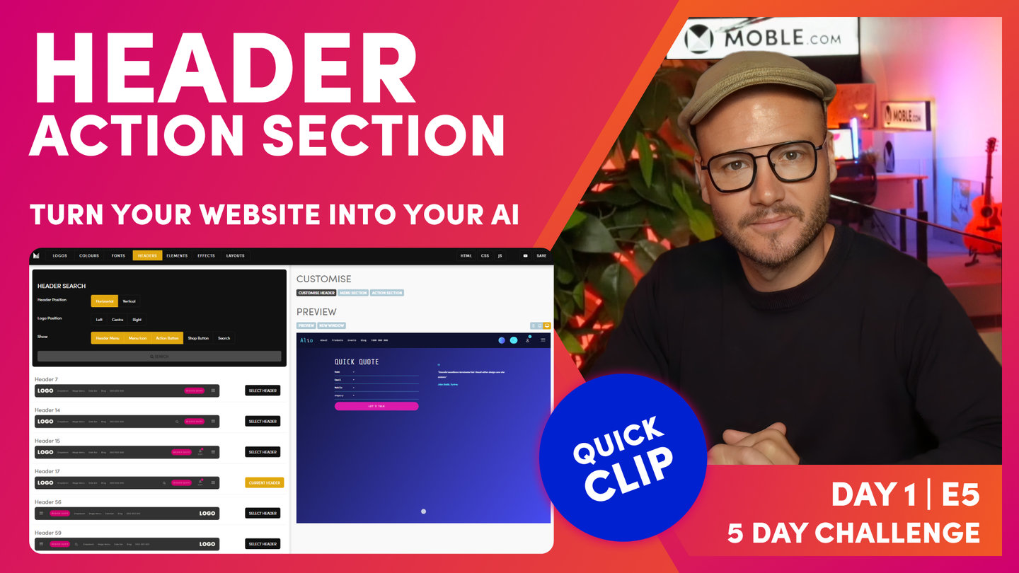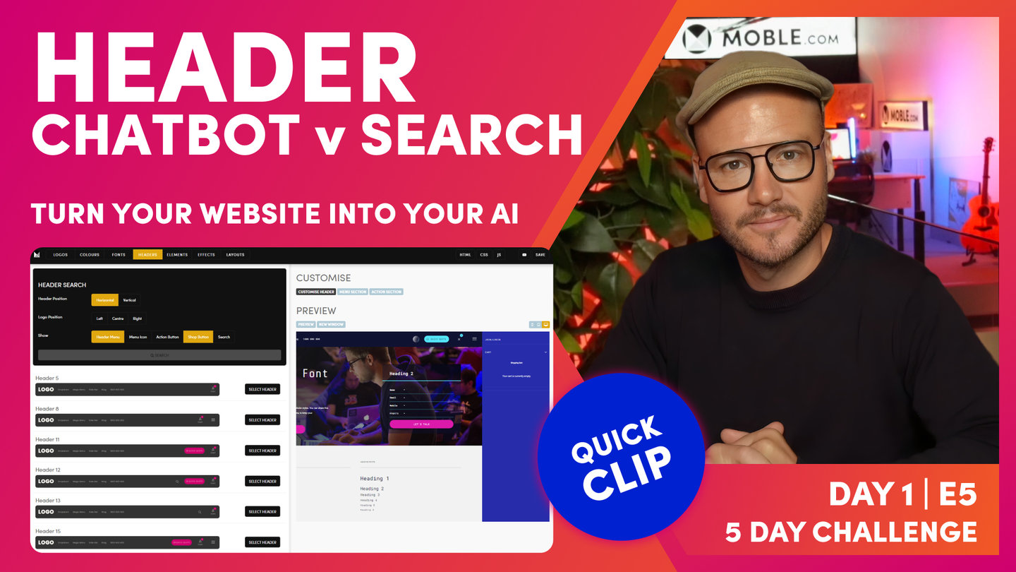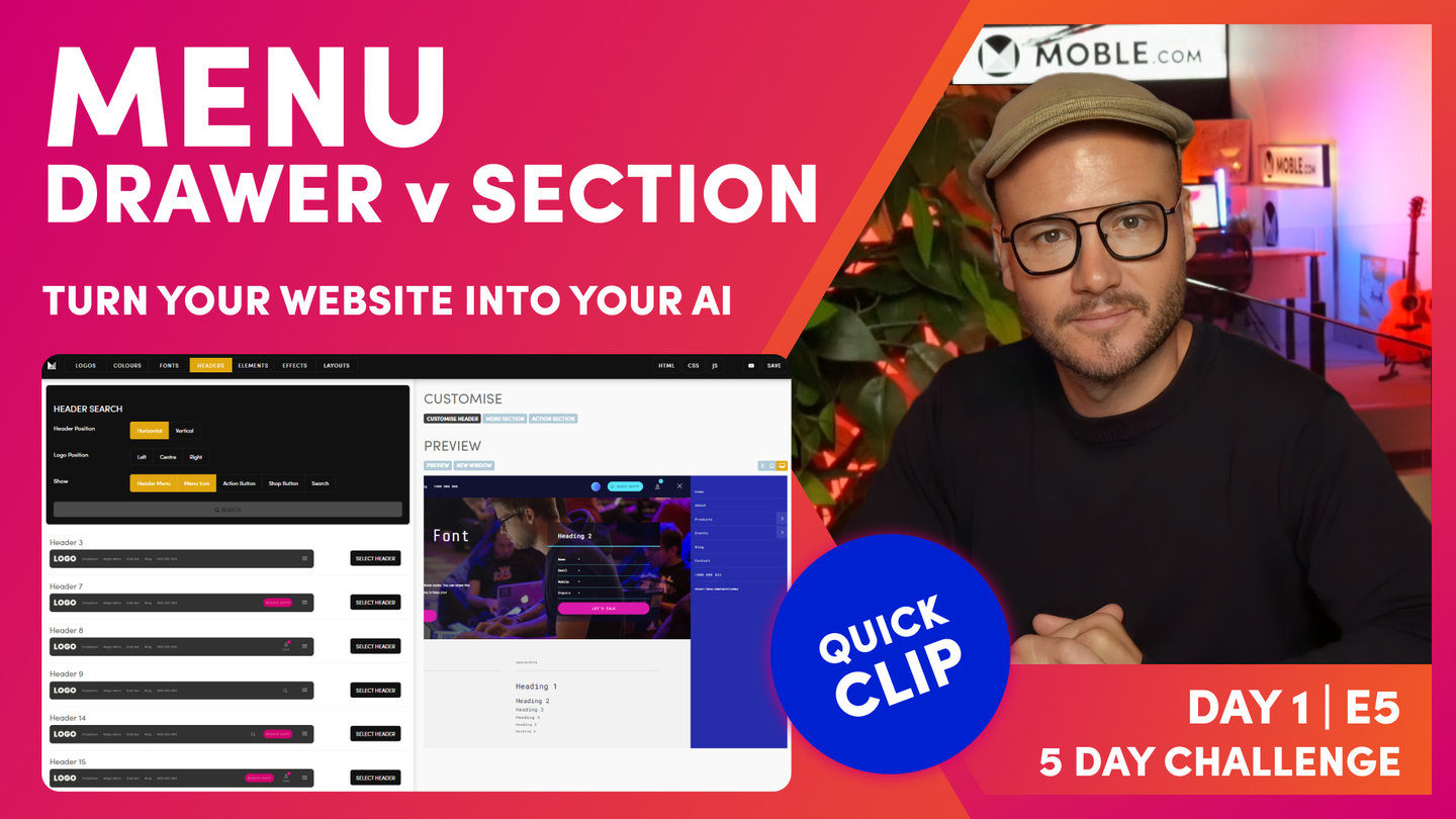 So think of this episode as a precursor, as a quick setup before we get to day two. So definitely just jump ahead, choose a header, and maybe choose some of the customised header preferences. You'll be flipping between the menus, the navigation area, and the header area tomorrow in episode one. Okay. And the third thing to realise is, although we've got a 100 pre-formatted headers here, and we'll always add in more, you can actually go and customise your own headers with HTML, CSS and JavaScript if you know code but that's not part of the five-day challenge, so stay tuned for later masterclass episodes, where we'll focus on that. And if you don't know code, you might be able to learn code quite quickly when you watch these masterclass sessions because the coding here is not so complicated. So without further ado, let's get on with it. Let's pick your header and then race through it and we'll move on to the next episode.