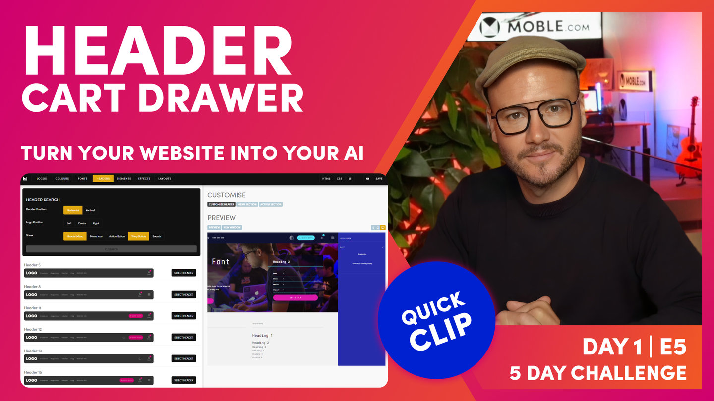 If you would like to customise your own Header with HTML, CSS and JS tweaks, please feel free to contact MOBLE at www.moble.com/lets-talk and we will be happy to assist and point you in the right direction.