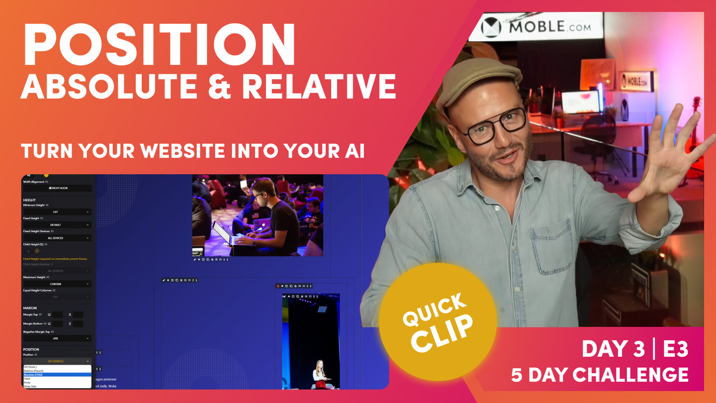 This is ‘absolute’ ‘bottom right’ ‘relative’ to the ‘parent’. So that is it. In CSS this is an absolute and relative positional relationship. There are many instances when a Web Developer would use this. In MOBLE, this is a bit of an edge case, in MOBLE we decide to use Child Height %, before we fall back on Absolute and Relative, as Child Height % is much easier to use and conflicts with less things. This is the reason why I taught you Child Height % first, when we created your Hero Section banner. Frontend developers, however, are not building for designers or for the content team. They are only building for that one instance, therefore, they will tend to use the Absolute and Relative relationship. Here’s a trick. When you use Absolute and Relative say this sentence. This is the ‘absolute child position’ ‘relative to the parent frame. Lovely, okay, so I think you get that. Absolute is the Child and Relative is the parent that you are anchoring the child too. Easy right?!"