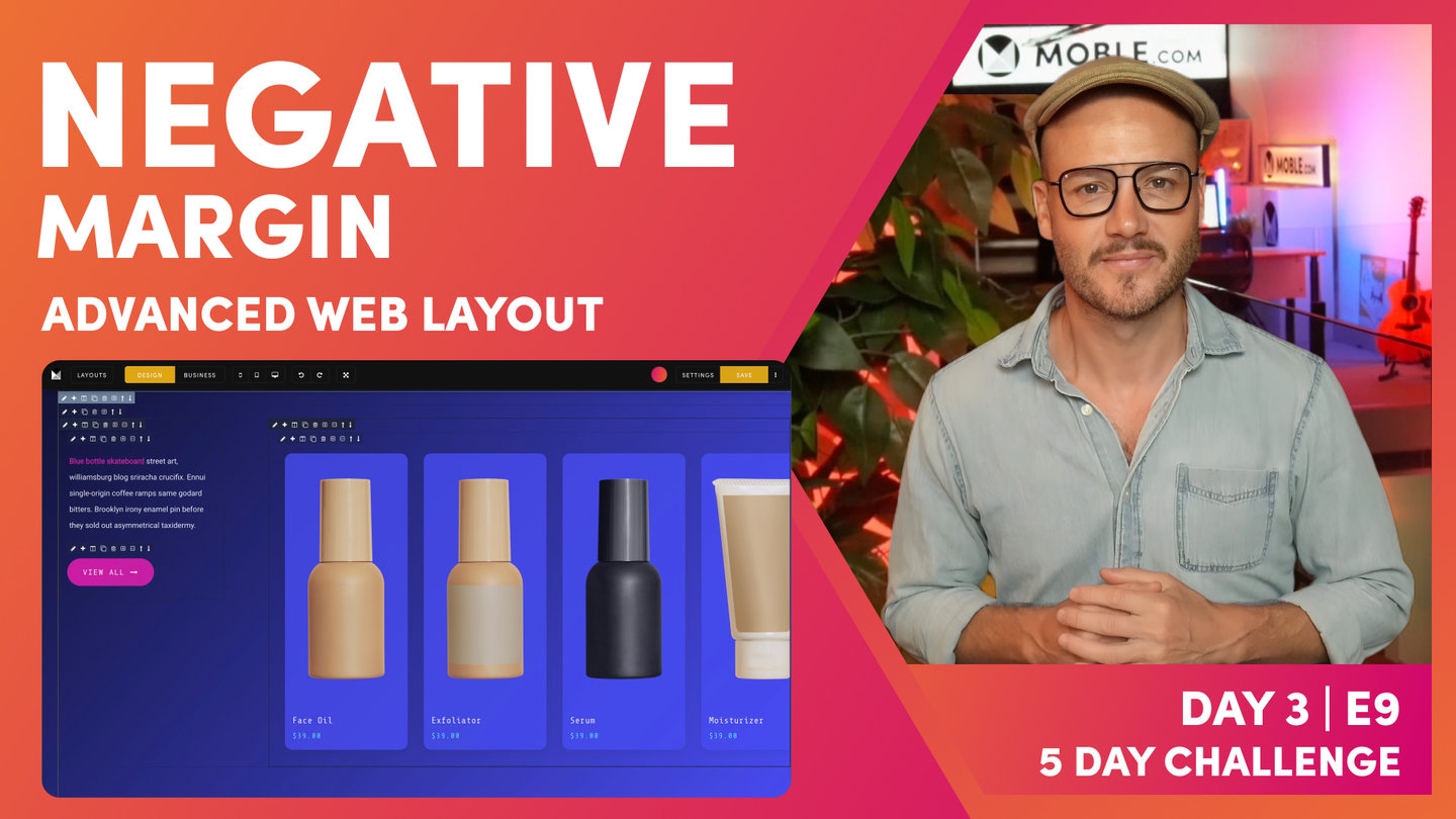 So, I want it to be more than 900 pixels. So, I'm just thinking logically here. So, now I'm going to go to this entire frame here. I'm going to pick this up. I'm going to move it over the top of there. I'm going to do this with negative margin. So, let's go down to our frame. Here's our frame, and in the frames I'm going to roll down to where it says negative margin just here, and I'm actually going to select something that's greater than 900. Well, you can see here I've got 960, so I put 960 in. Now again, design mode. As you know, you wouldn't to see something shift in design mode because it's a blueprint, so we can see all of the frames. But if I pop to business mode, we can see our effect is in place there. So, I'll just show you one more class that's coming soon here.